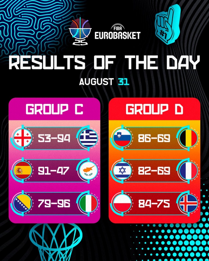 09月01日讯 男篮欧锦赛当地时间8月31日的6场小组赛全部结束,详细赛果如下: